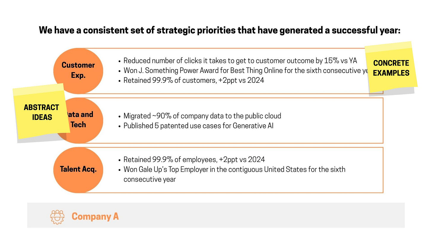 The writer outlines outline three components of their company’s strategic priorities, which are broad. On the right, the writer gives these general themes substance by providing examples.